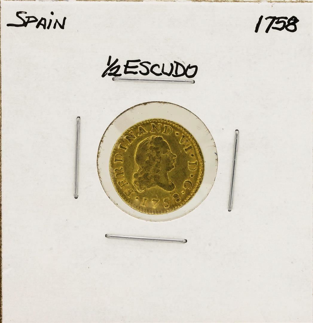 One 1758 Ferdinand VI Spanish 1/2 Escudos Gold Coin.