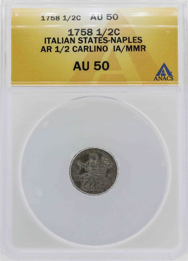 One 1758 Italian States-Naples 1/2 Carlino Coin ANACS AU50. ANACS Certified.