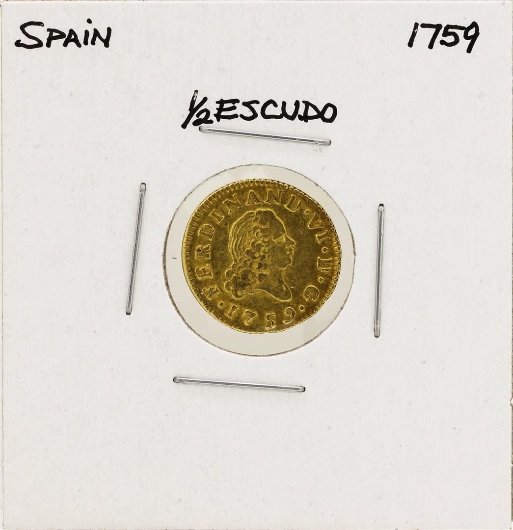 One 1759 Ferdinand VI Spanish 1/2 Escudos Gold Coin.