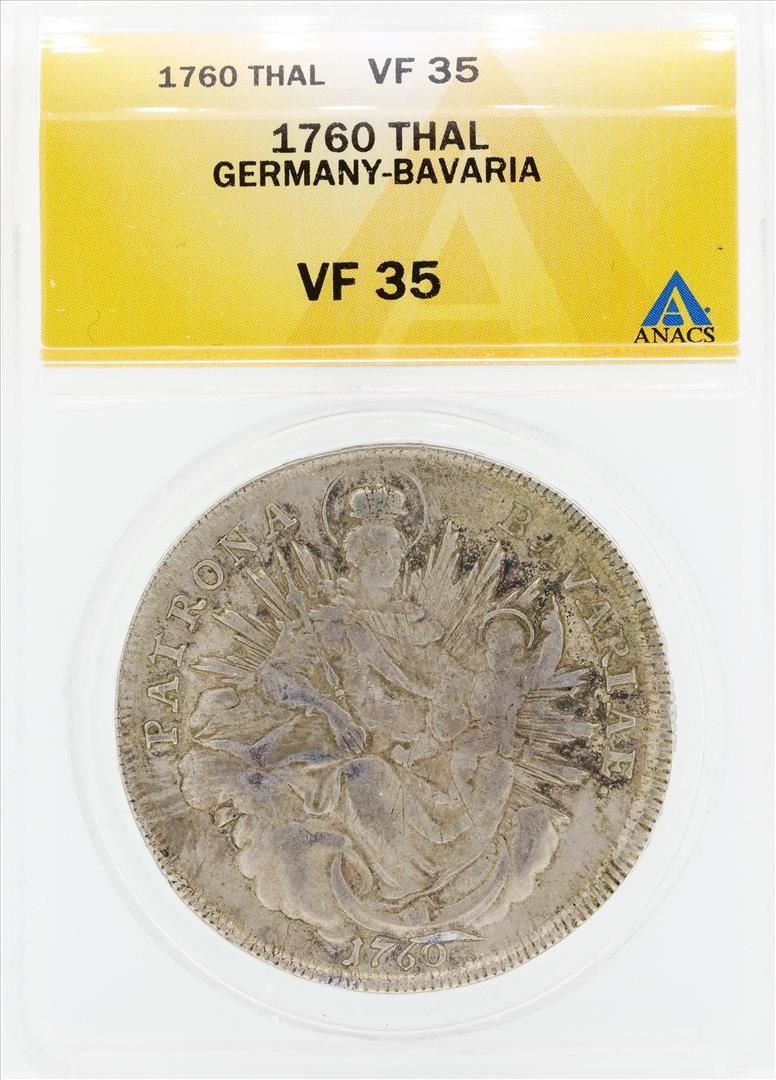 One 1760 Thal Germany Bavaria Coin ANACS VF35. ANACS Certified.