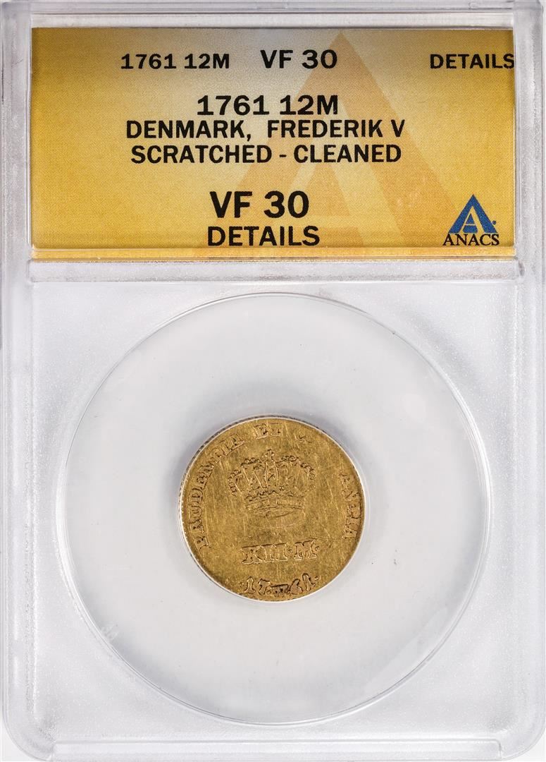 One 1761 Denmark Fredrik V 12 Mark Coin ANACS VF30 Details. ANACS Certified.
