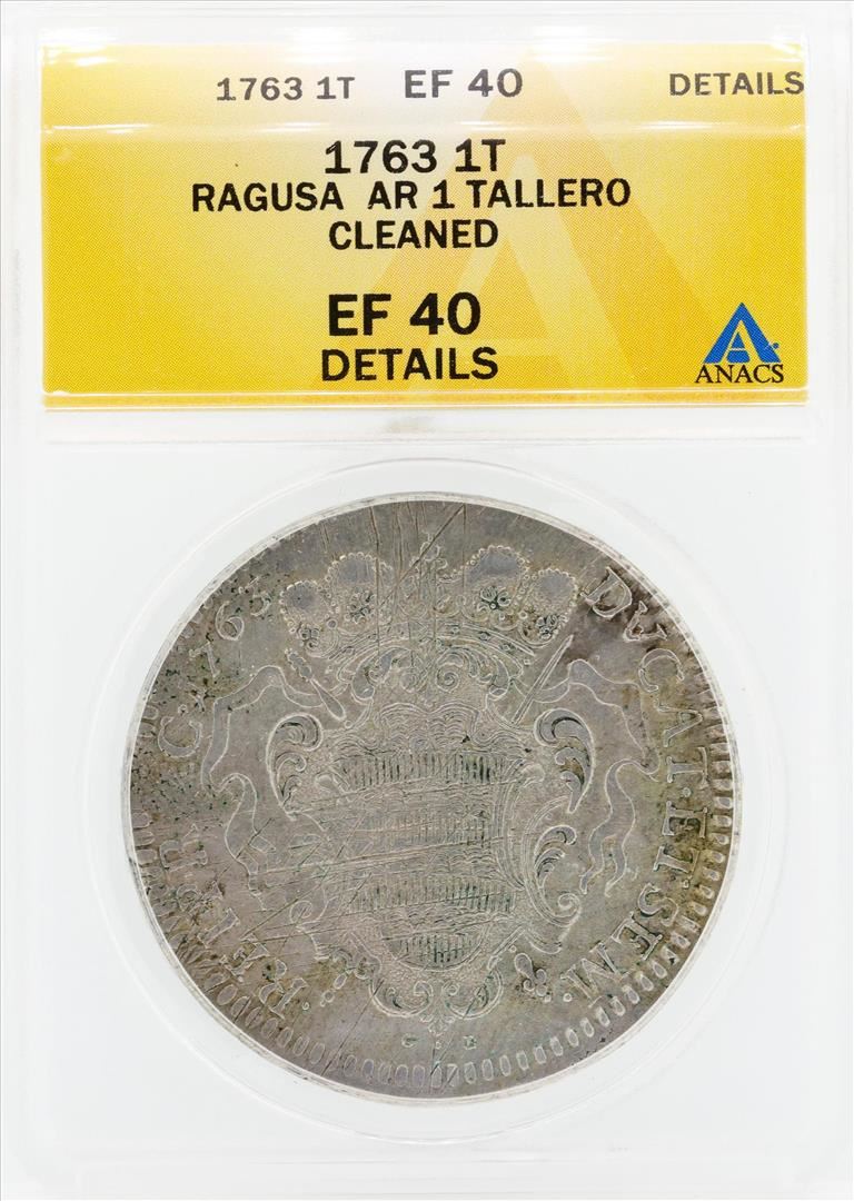 One 1763 Ragusa AR 1 Tallero Cleaned Coin ANACS EF40 Details. ANACS Certified.