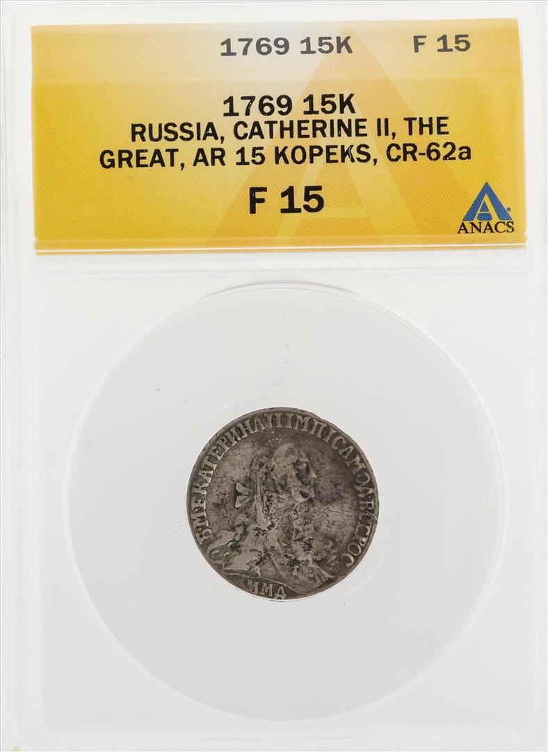 One 1769 15 Kopeks Russia Catherine II The Great AR CR62a Coin ANACS F15. ANACS Certified.