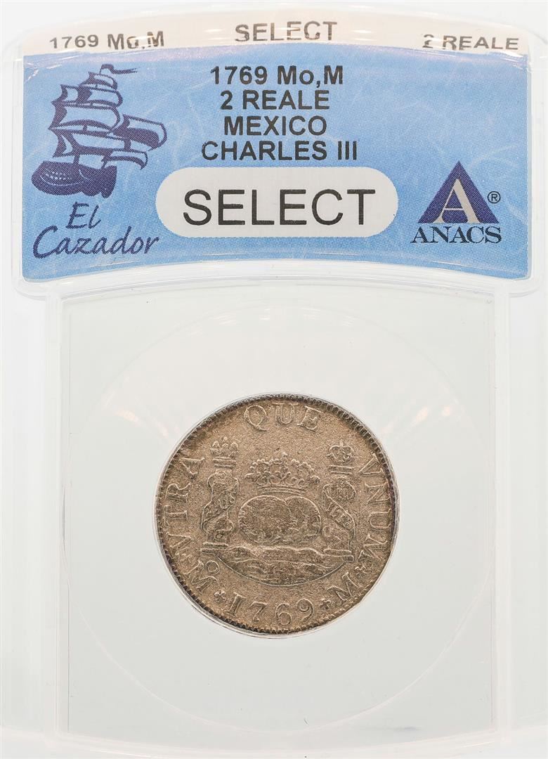 One 1769MoM Mexico 2 Reales Charles III El Cazador Shipwreck Coin ANACS Select. ANACS Certified.