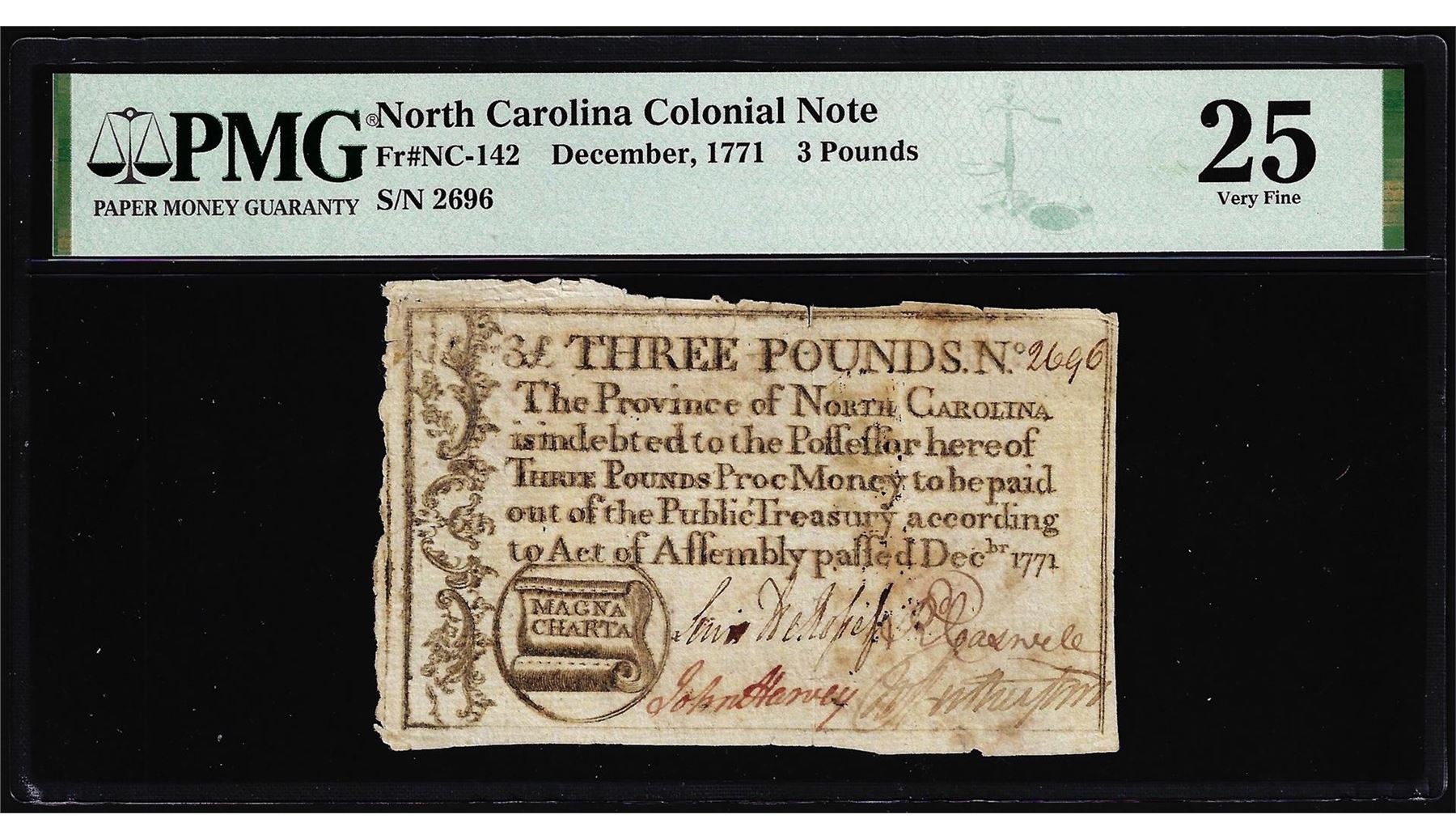 1771 North Carolina 3 Pounds Colonial Note NC-142 PMG Very Fine 25 Magna Charta