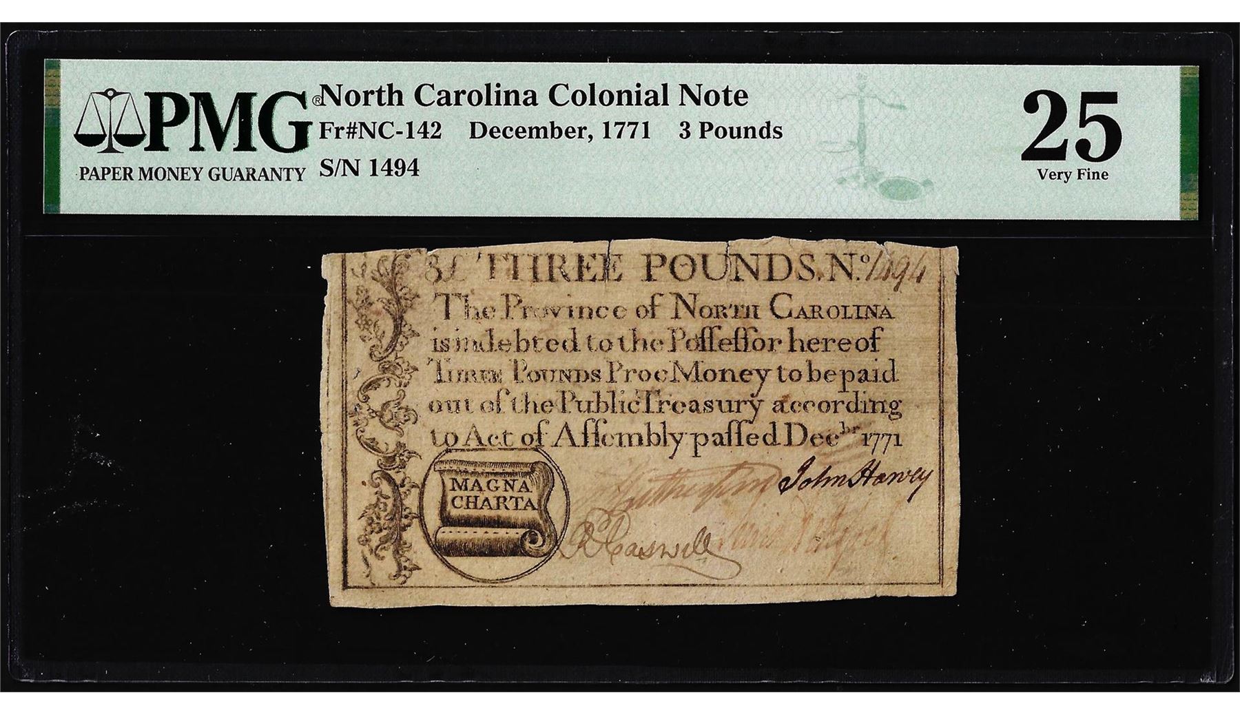 1771 North Carolina 3 Pounds Colonial Note NC-142 PMG Very Fine 25 Magna Charta