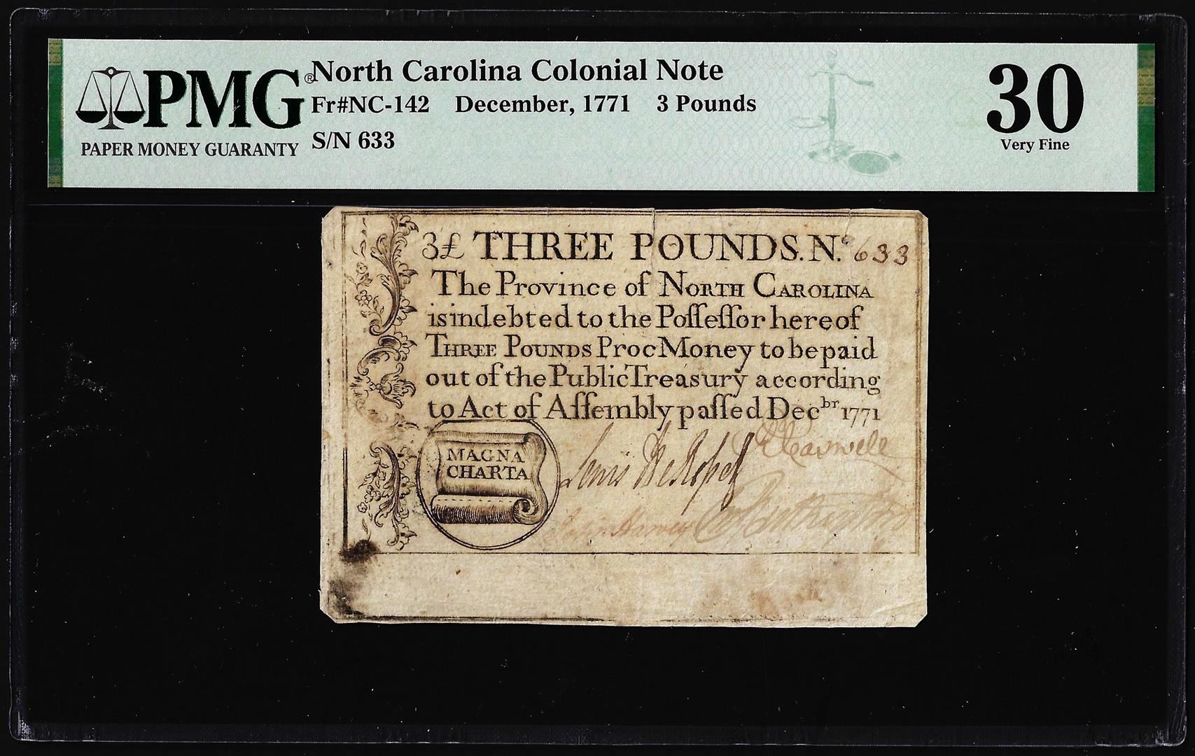1771 North Carolina 3 Pounds Colonial Note NC-142 PMG Very Fine 30 Magna Charta