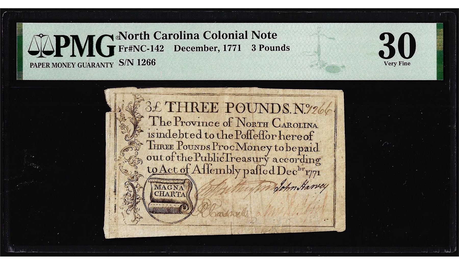 1771 North Carolina 3 Pounds Colonial Note NC-142 PMG Very Fine 30 Magna Charta