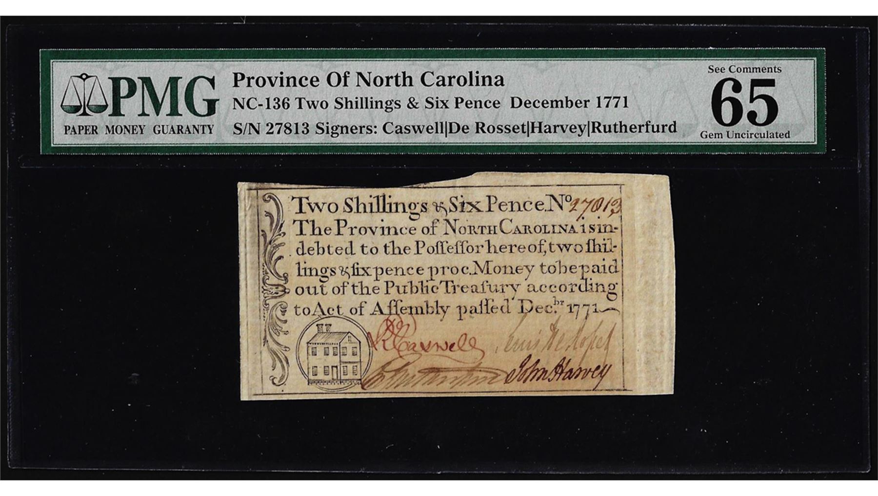 One 1771 North Carolina Province 2 Shillings & 6 Pence Colonial Note PMG Gem Unc. 65EPQ. PMG Certified.