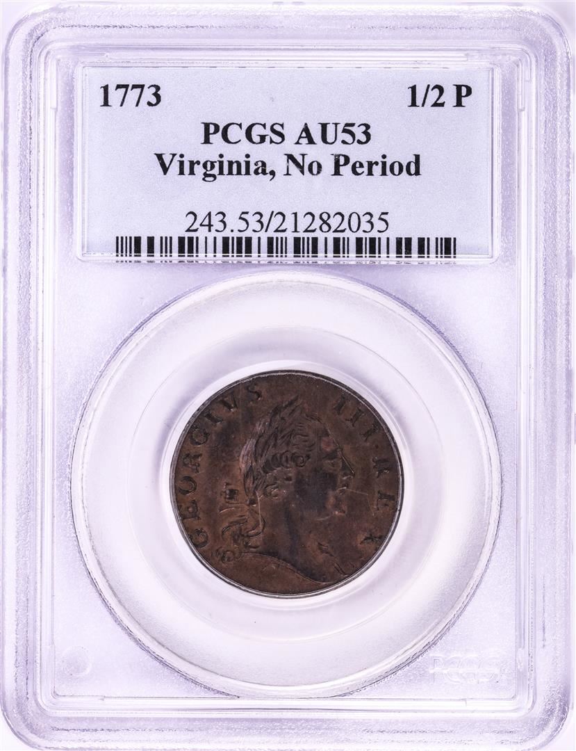 One 1773 Virginia No Period Colonial Half Penny Coin PCGS AU53. PCGS Graded.