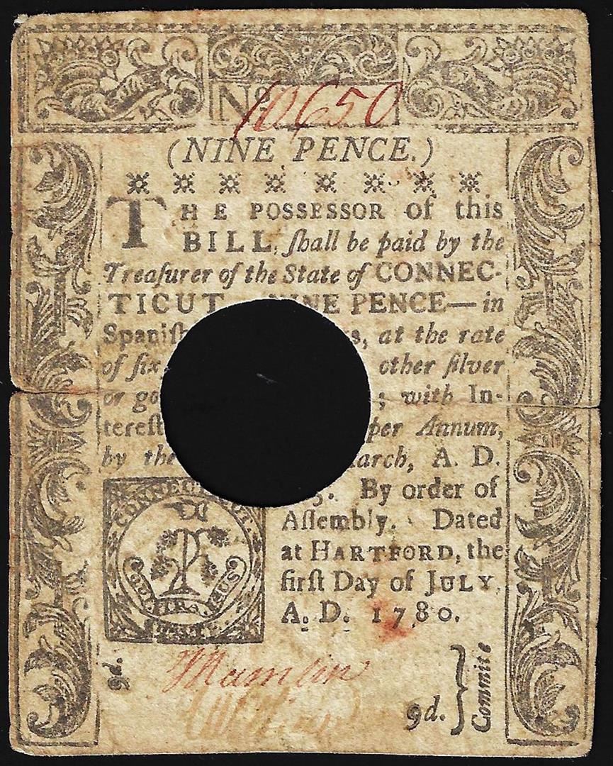 One 1780 Connecticut Nine Pence Colonial Currency Note.