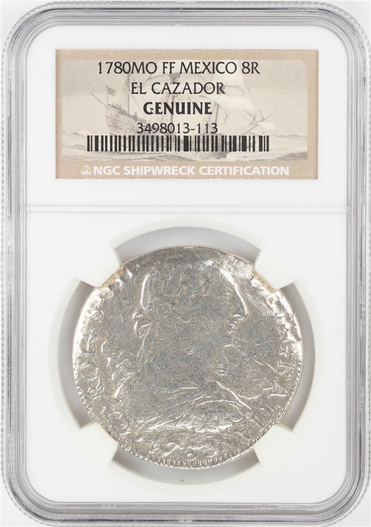One 1780MO FF Mexico 8 Reales El Cazador Shipwreck Coin NGC Genuine. NGC Certified.