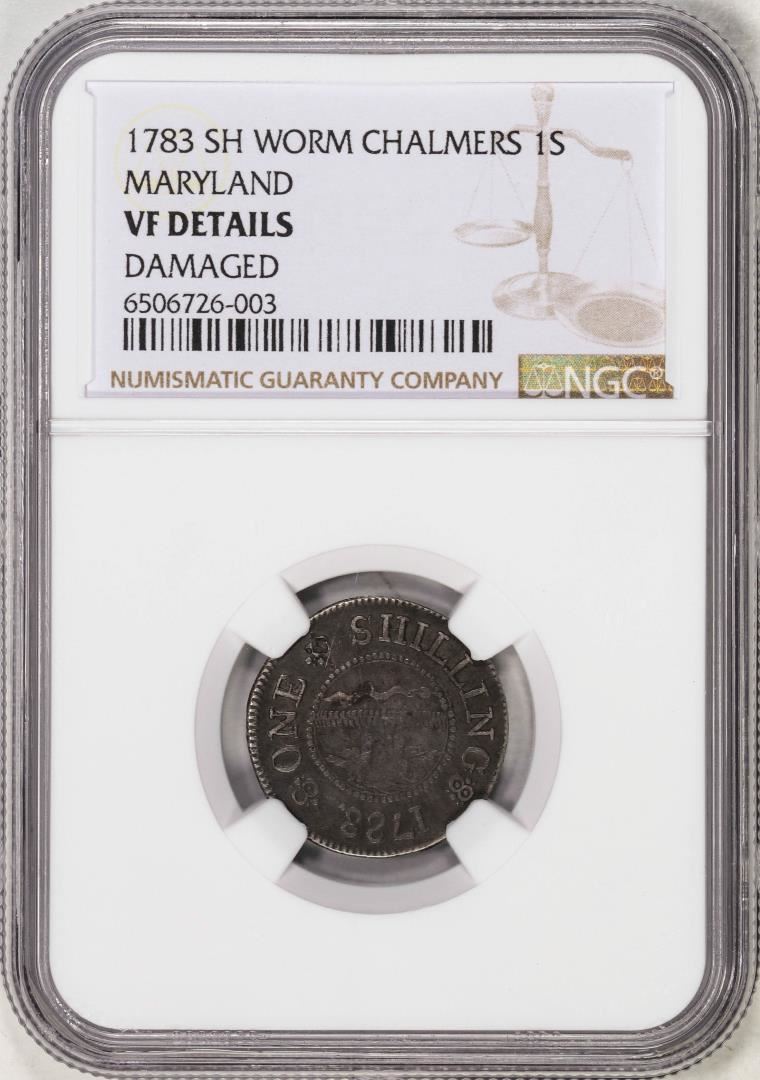 One 1783 SH Worm Chalmers Shilling Maryland Colonial Coin NGC VF Details. NGC Certified.
