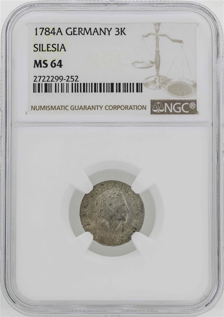 One 1784-A Germany Silesia 3 Krezuer Coin NGC MS64. NGC Certified.