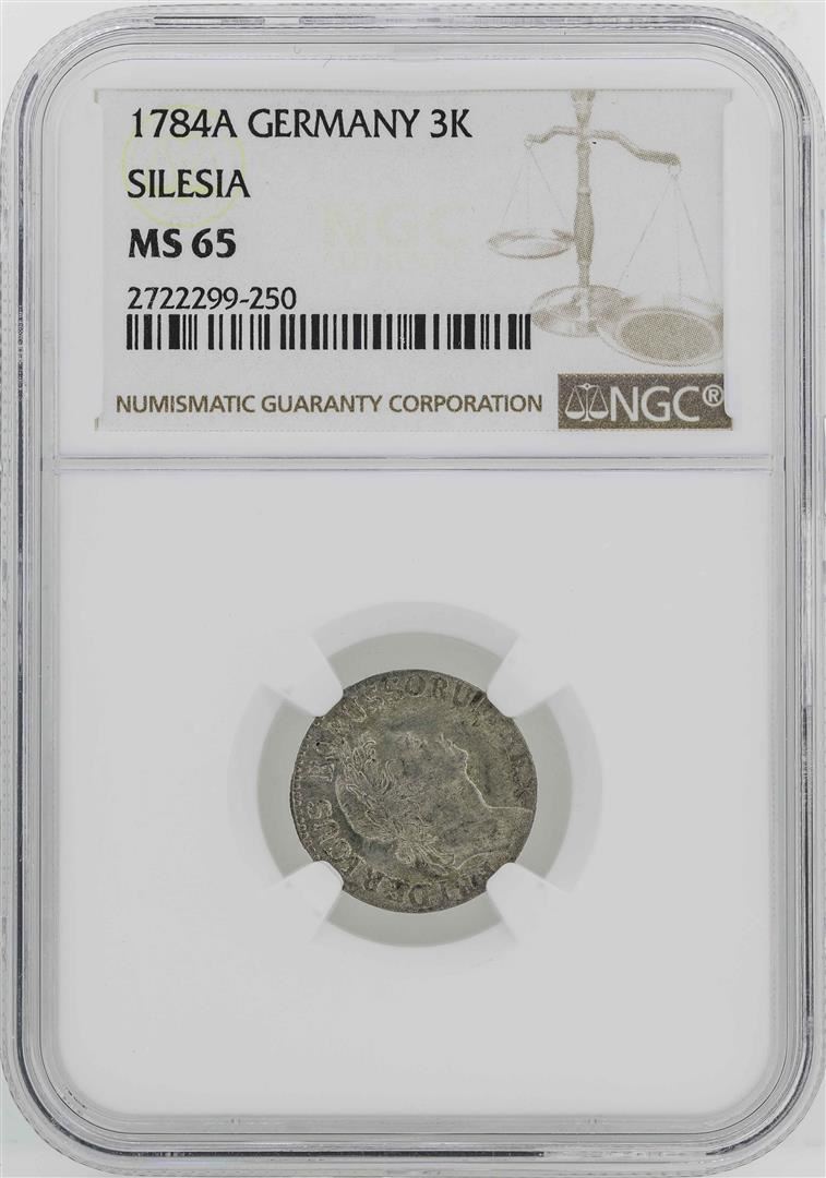One 1784-A Germany Silesia 3 Krezuer Coin NGC MS65. NGC Certified.