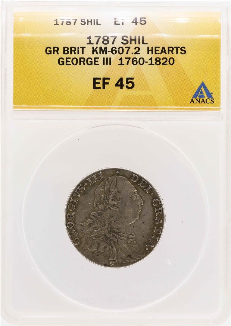1787 England KM-607.2 Hearts George III Shilling Coin ANACS XF45