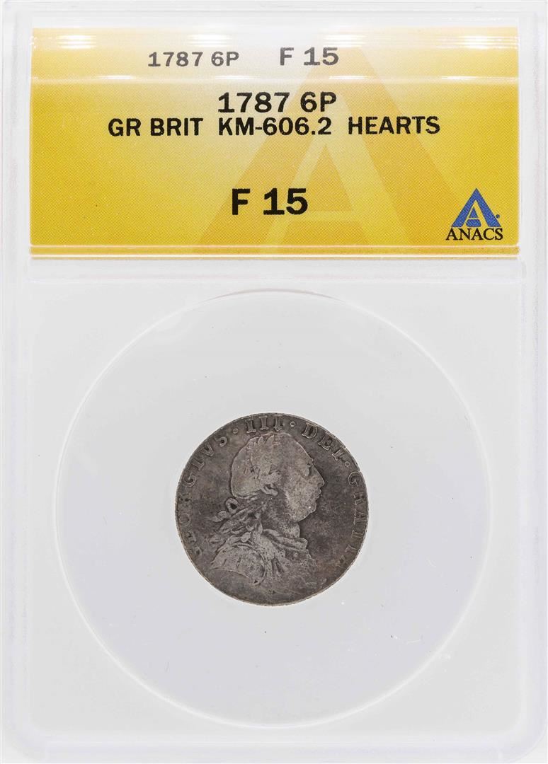 One 1787 Great Britain 6 Pence Hearts KM-606.2 Silver Coin ANACS F15. ANACS Certified.