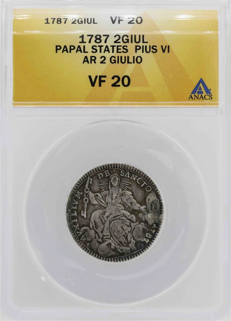 One 1787 Papal States Pius VI 2 Giulio Coin ANACS VF20. ANACS Certified.