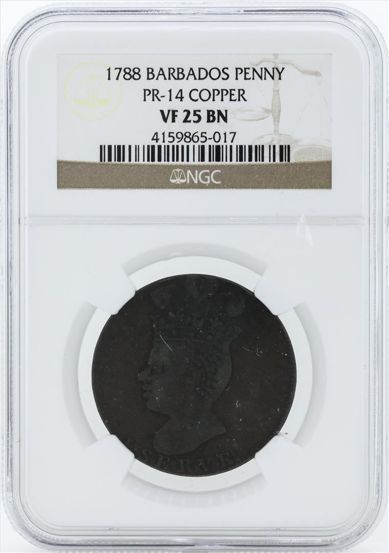 One 1788 Barbados Copper Penny NGC VF 25 BN. NGC Certified.
