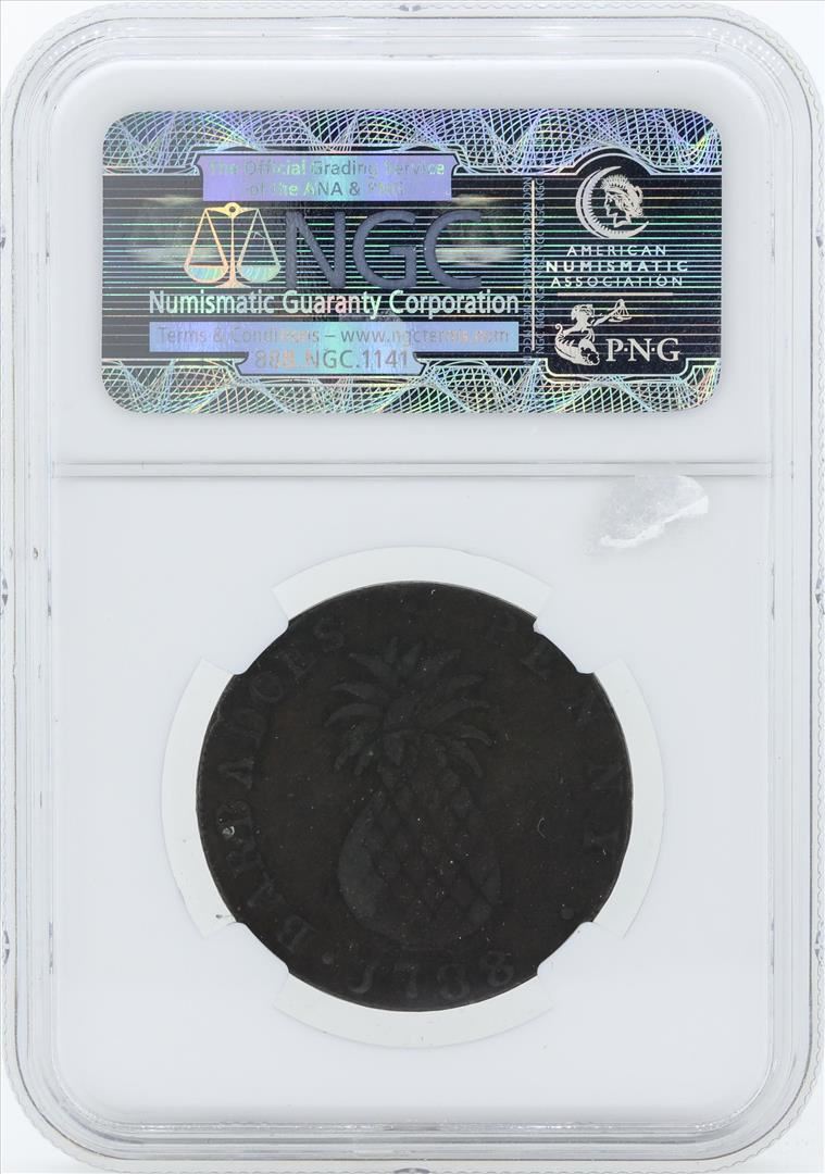 One 1788 Barbados Copper Penny NGC VF 25 BN. NGC Certified.