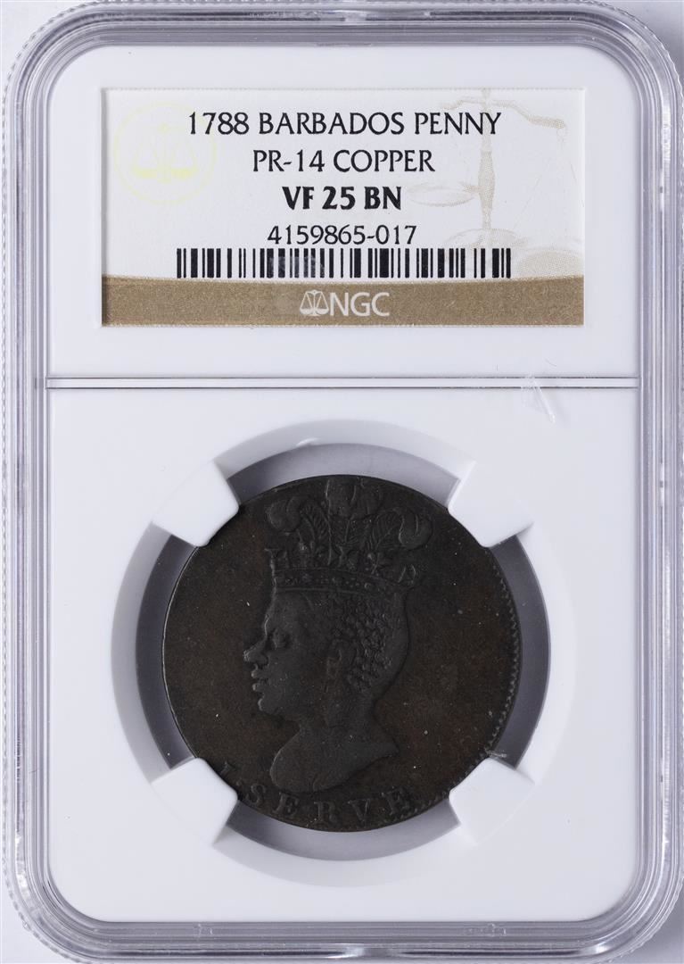 One 1788 Barbados Copper Penny NGC VF 25 BN. NGC Certified.