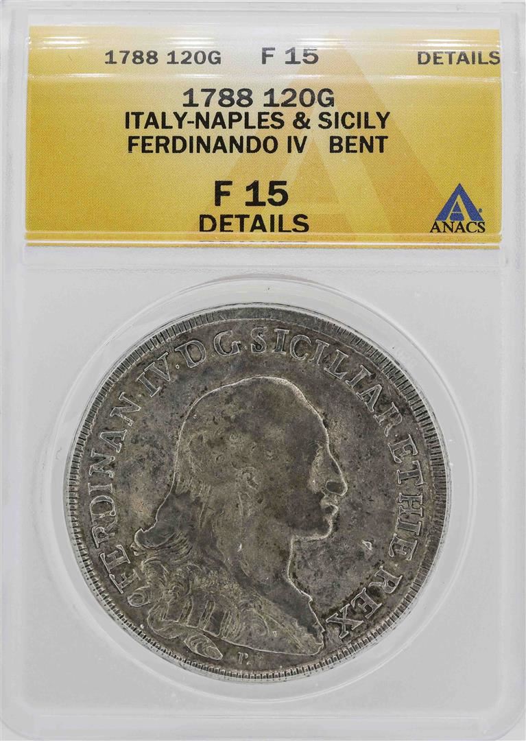 One 1788 Italy-Naples & Sicily Ferdinando IV 120 Grana Coin ANACS F15 Details. ANACS Certified.