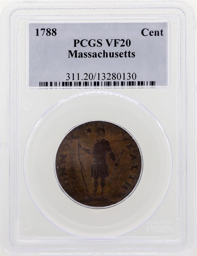 One 1788 Massachusetts Colonial Copper Cent Coin PCGS VF20. PCGS Graded.
