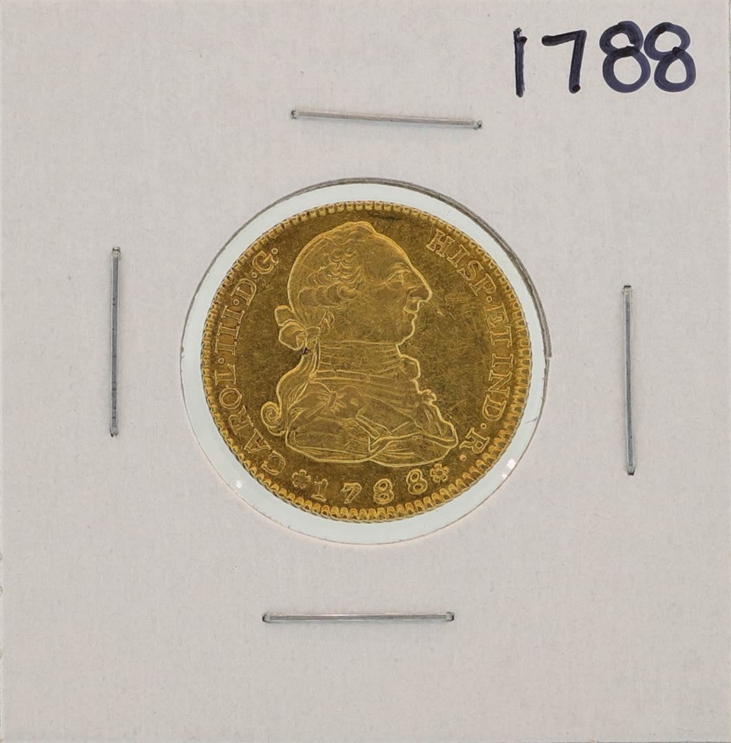 One 1788 Spanish 2 Escudos Carol III Gold Coin.