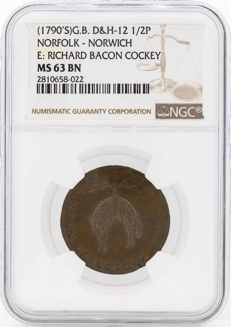One 1790's Great Britain 1/2 Penny Norfolk Norwich Coin NGC MS63BN. NGC Certified.