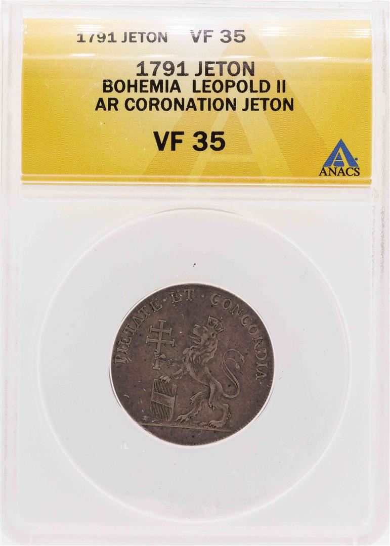 One 1791 Bohemia Leopold II AR Coronation Jeton Coin ANACS VF35. ANACS Certified.