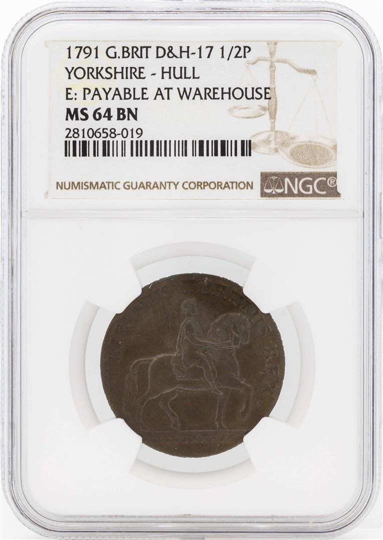 One 1791 Great Britain 1/2 Penny Yorkshire Hull Coin NGC MS64BN. NGC Certified.