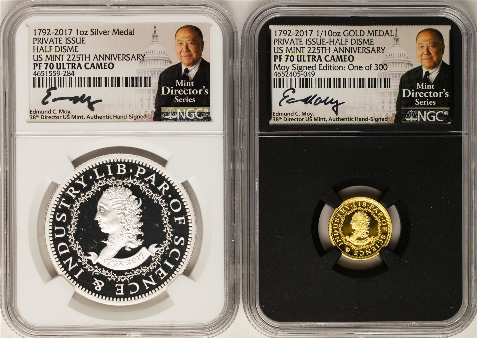 One 1792-2017 Half Disme 1/10 oz. Gold & 1oz. Silver Medals NGC PF70 W/ Moy Signature Set. NGC Certified.