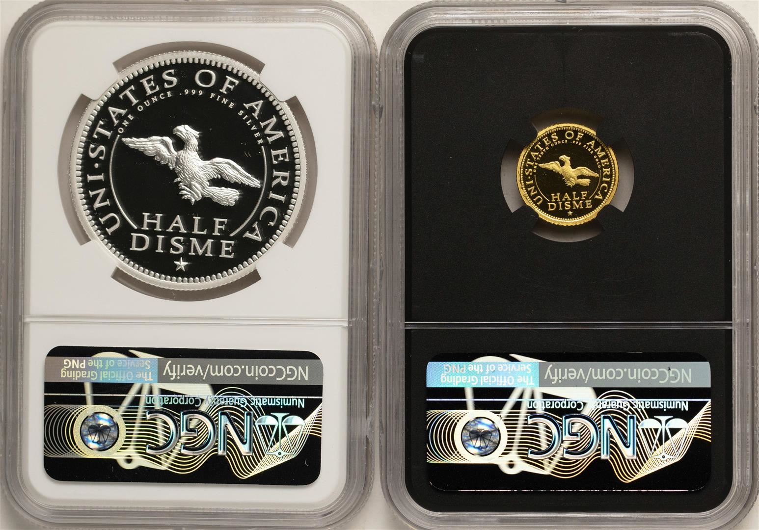 One 1792-2017 Half Disme 1/10 oz. Gold & 1oz. Silver Medals NGC PF70 W/ Moy Signature Set. NGC Certified.