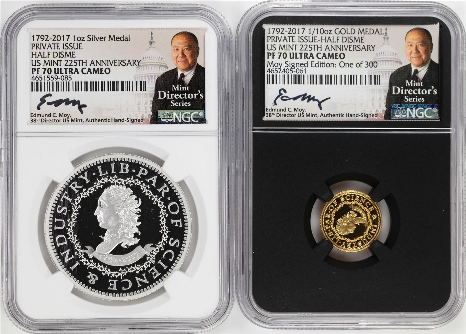 One 1792-2017 Half Disme 1/10 oz. Gold & 1oz. Silver Medals NGC PF70 W/ Moy Signature Set. NGC Certified.