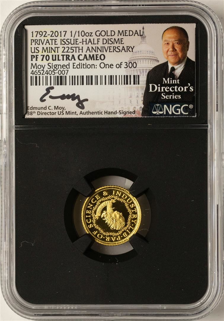 One 1792-2017 Half Disme 1/10 oz. Gold Medal NGC PF70 W/Edmund C. Moy Signature. NGC Certified.