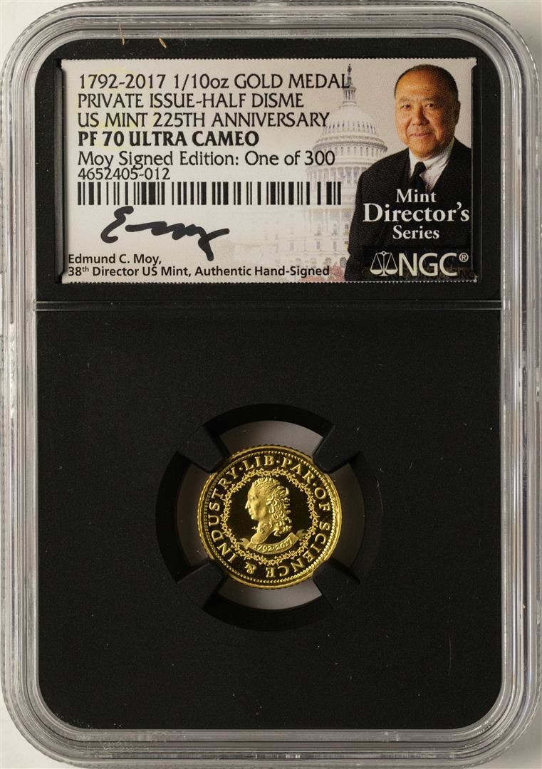 One 1792-2017 Half Disme 1/10 oz. Gold Medal NGC PF70 W/Edmund C. Moy Signature. NGC Certified.