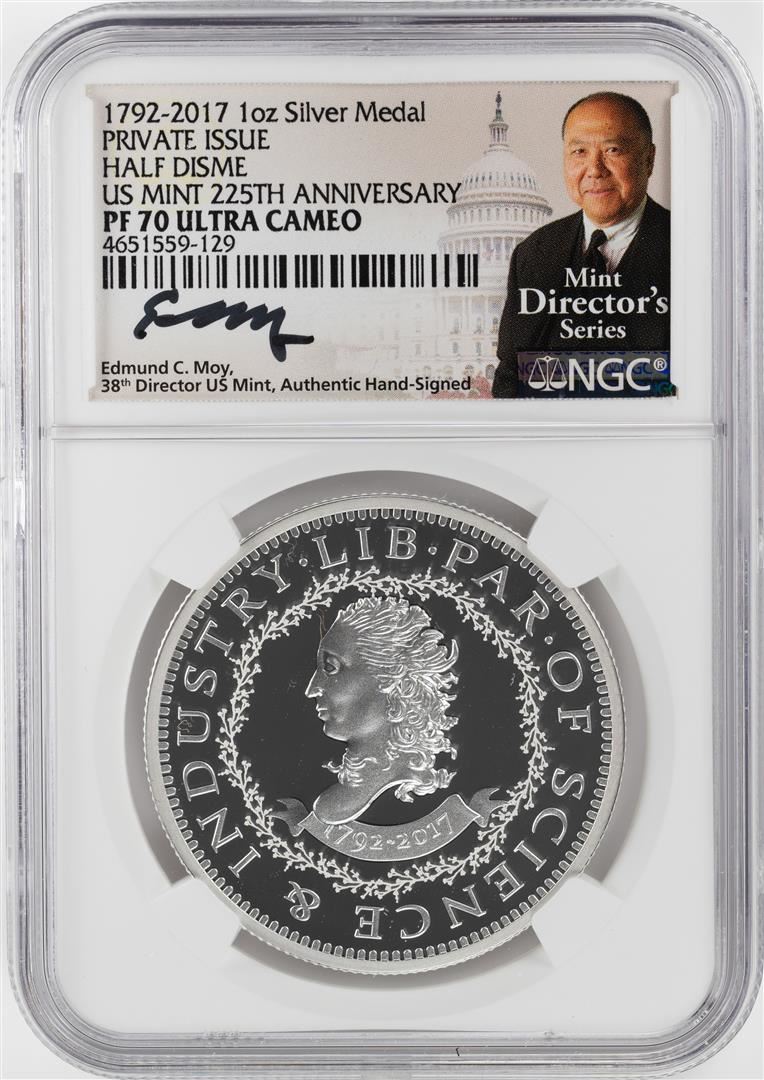 One 1792-2017 Half Disme 1 oz. Silver Medal NGC PF70 W/Edmund C. Moy Signature. NGC Certified.