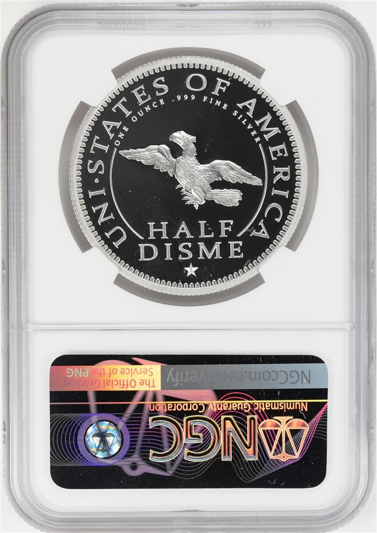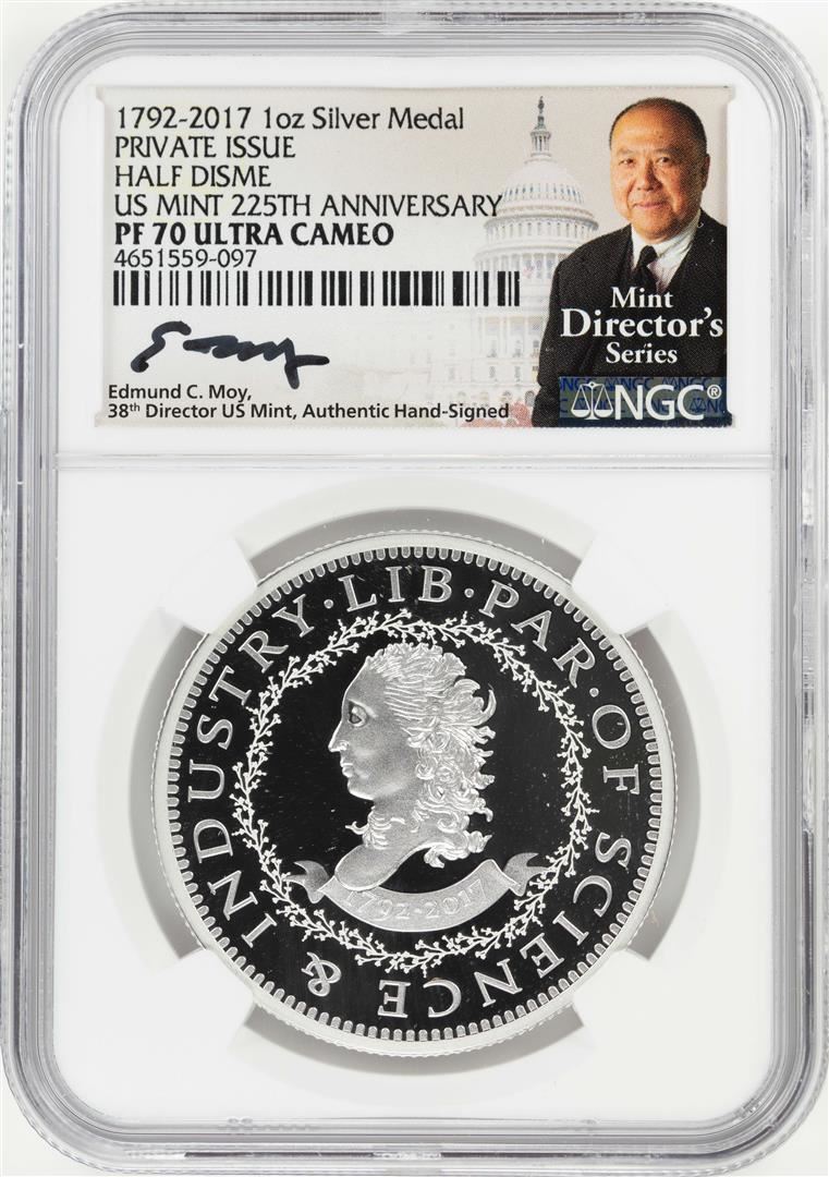 One 1792-2017 Half Disme 1 oz. Silver Medal NGC PF70 W/Edmund C. Moy Signature. NGC Certified.