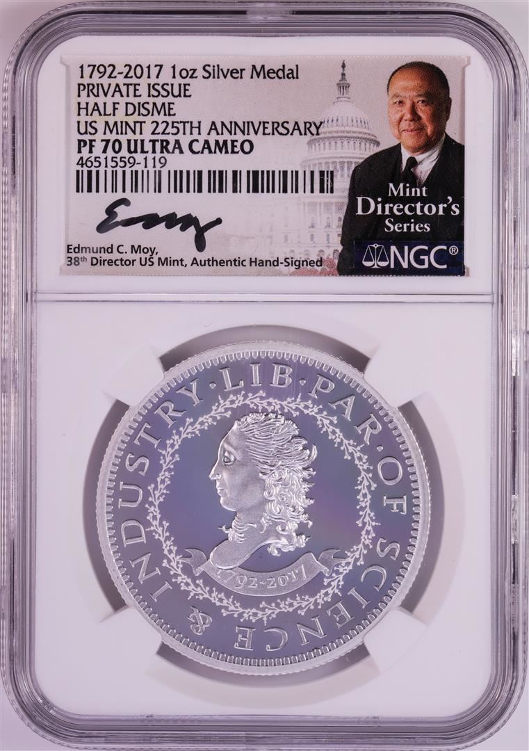 One 1792-2017 Half Disme 1 oz. Silver Medal NGC PF70 W/Edmund C. Moy Signature. NGC Certified.