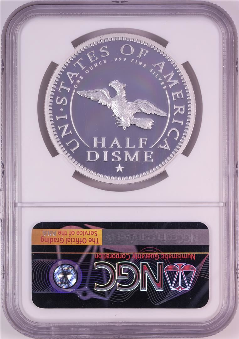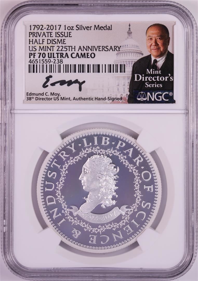 One 1792-2017 Half Disme 1 oz. Silver Medal NGC PF70 W/Edmund C. Moy Signature. NGC Certified.
