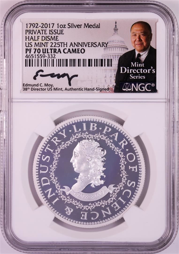 One 1792-2017 Half Disme 1 oz. Silver Medal NGC PF70 W/Edmund C. Moy Signature. NGC Certified.