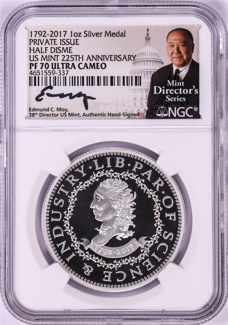 One 1792-2017 Half Disme 1 oz. Silver Medal NGC PF70 W/Edmund C. Moy Signature. NGC Certified.