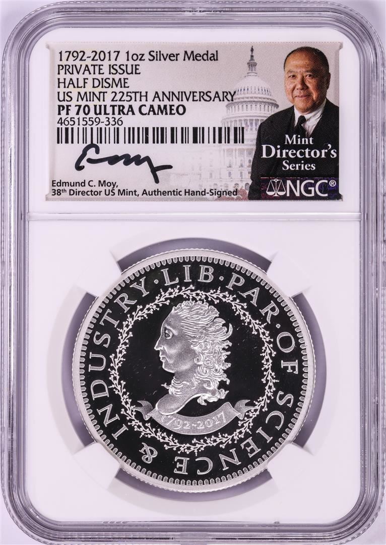 One 1792-2017 Half Disme 1 oz. Silver Medal NGC PF70 W/Edmund C. Moy Signature. NGC Certified.