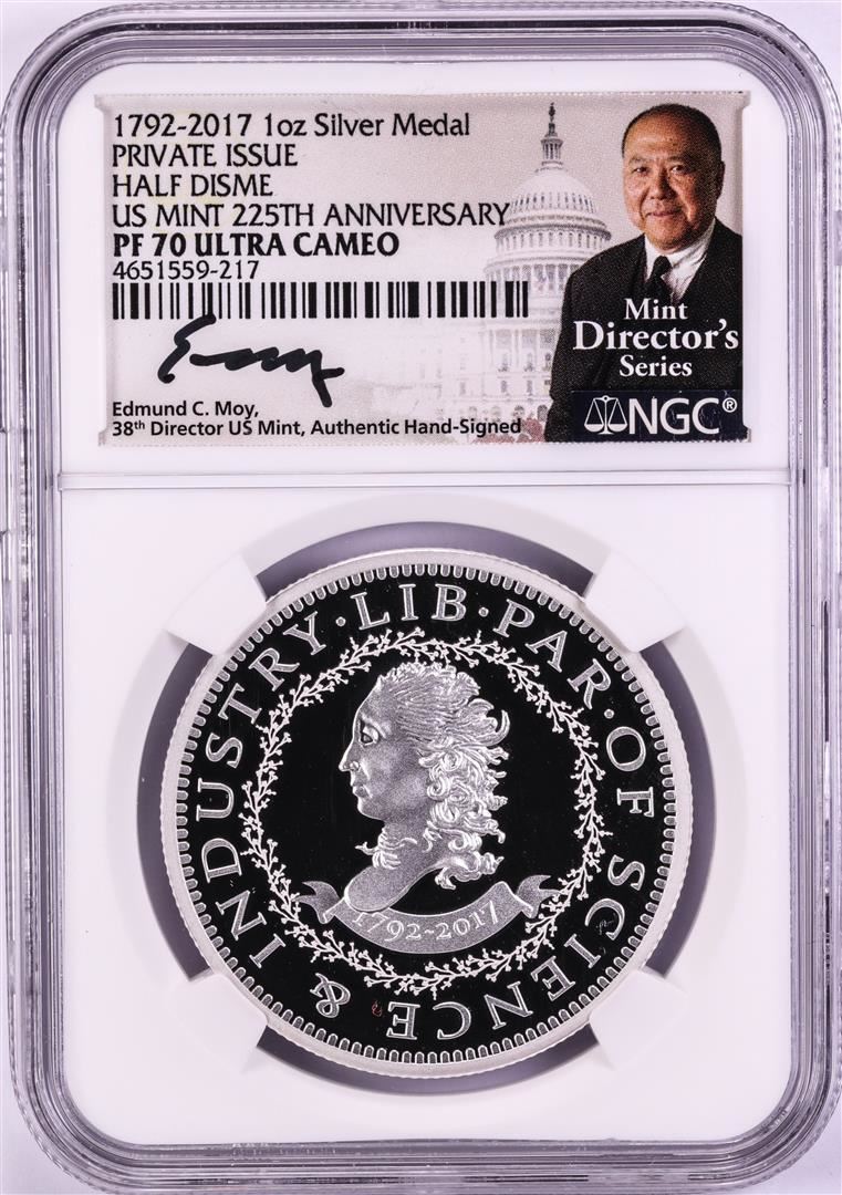 One 1792-2017 Half Disme 1 oz. Silver Medal NGC PF70 W/Edmund C. Moy Signature. NGC Certified.