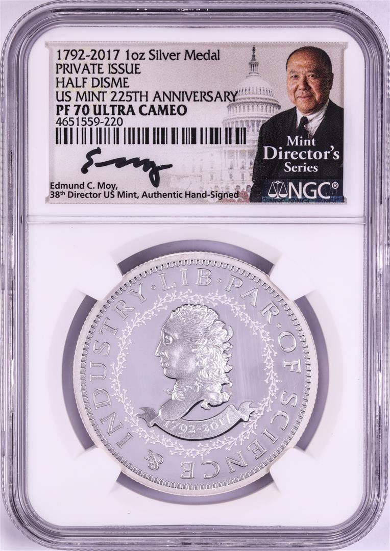 One 1792-2017 Half Disme 1 oz. Silver Medal NGC PF70 W/Edmund C. Moy Signature. NGC Certified.