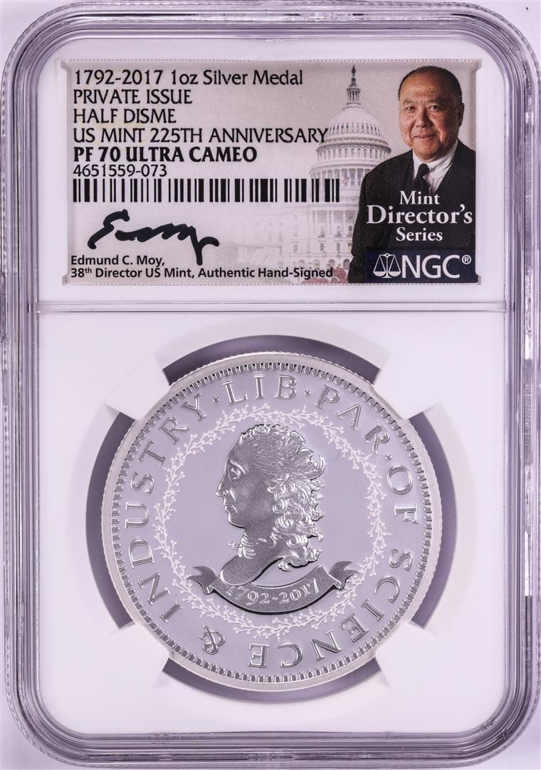 One 1792-2017 Half Disme 1 oz. Silver Medal NGC PF70 W/Edmund C. Moy Signature. NGC Certified.