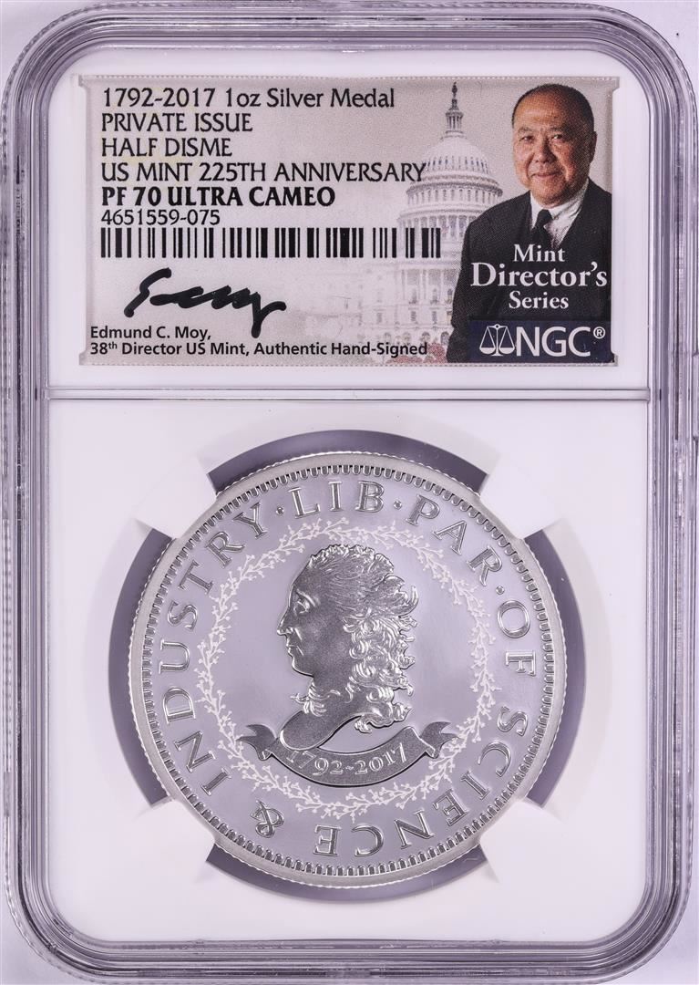 One 1792-2017 Half Disme 1 oz. Silver Medal NGC PF70 W/Edmund C. Moy Signature. NGC Certified.
