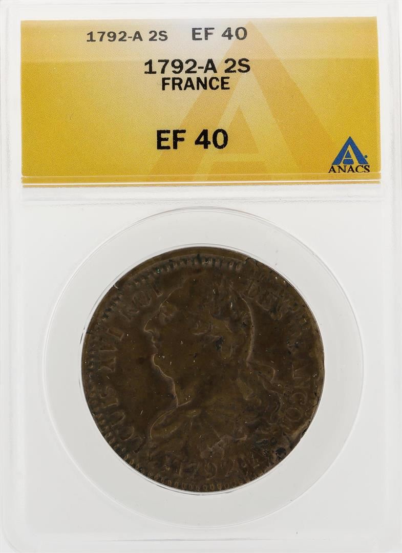 One 1792-A 2 Sols France Coin ANACS EF40. ANACS Certified.