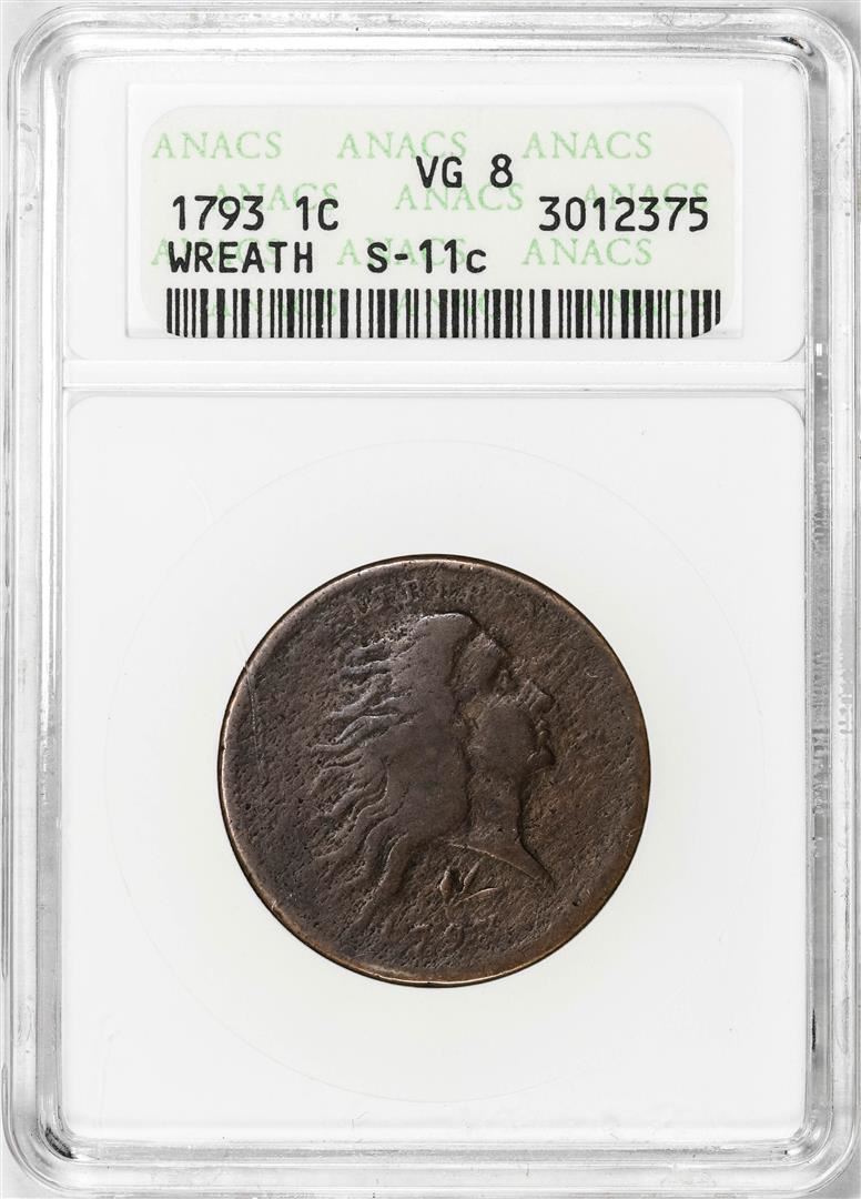 One 1793 S-11c Wreath Flowing Hair Copper Large Cent ANACS AG Details. ANACS Certified.