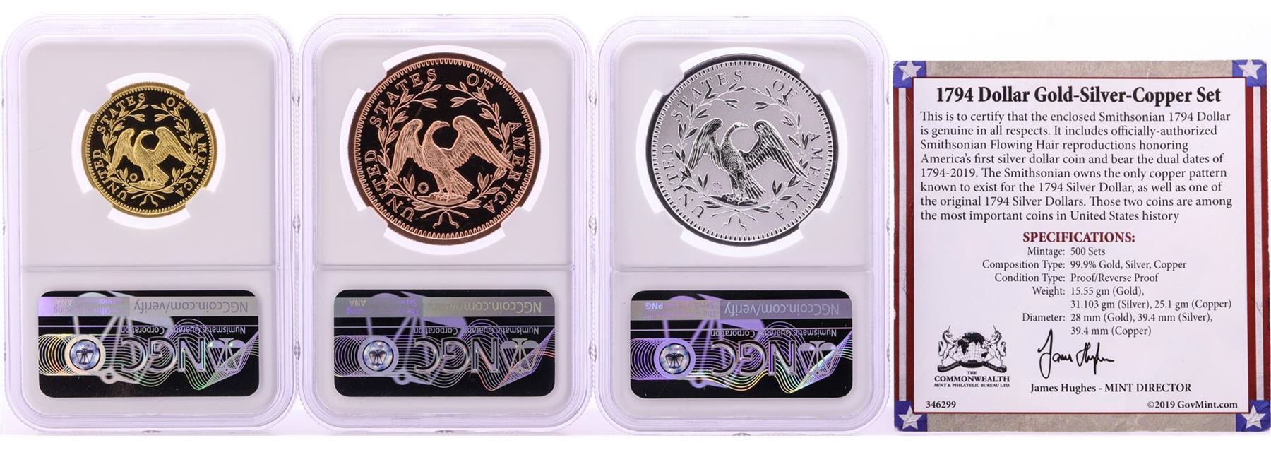 One 1794-2019 Smithsonian America's Finest Silver Dollar 3 Medal Set NGC PF70 Ultra Cameo. NGC Certified.